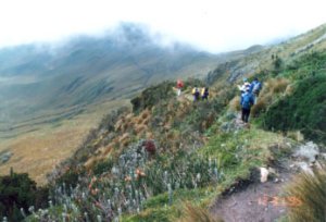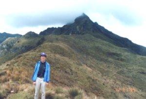 翌朝のキトーは濃霧。海抜2800mの盆地で霧が発生しやすい。計画ではパソッチャ(約4000m)に登ることになっていたが、場所が遠いという理由で、明日登頂予定のピチンチャ(4839m)の途中まで行くことに変更された。今後登山活動全般につきあっていただくガイド(ロムロ・バスニーニョ)とともに出発。