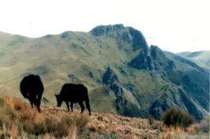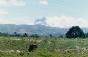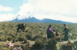 分岐から砂利道の登山車道を揺られて4800mの車道終点まで上がる。体慣らしの為5000mのウインパー小屋まで往復。脈や呼吸数を測る。多少の頭痛以外はまだそれほど高度障害は感じない。バスでリオバンバの町へ。途中夕日に赤く染まるチンボラソ峰が見事であった。ビターニャと呼ばれる高山の鹿が多い。日が暮れてもまだとおせんぼしているしぶとい村あり。こじんまりしたアットホームなホテルモンテカルロに到着、長距離ドライブで疲れた体を休める。