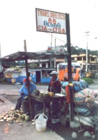 レインボーカラーのバスでアメリカ大陸縦断ハイウエイを南に走る。エクアドル火山通りと呼ばれ、ツインピークのイレネーザ,独立峰のトゥングラファ,岩山のエル・アルタールなど冠雪の5000m峰が望める。道わきの露店に立ち寄るとブタやモルモット(?)の丸焼きが豪快だが食べる気はしない。1000スクレの椰子の実は、ストローを刺して飲むと薄い乳性飲料の味でGood。途中の町で食べた3段アイス(三色のシャーベット風)は大好評。チーズもクリーミーで食べやすい。