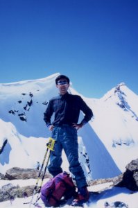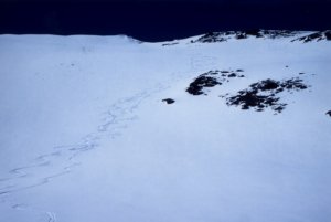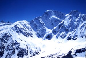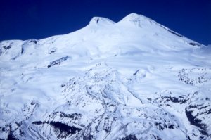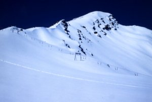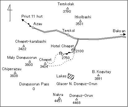 リフトが動き出すのはのんびりしたロシアタイムの10時。2本のリフトのうち1人乗りリフト まで階段を上がって、スキーを手に持って荷物をお腹側に背負ってリフトに乗る。2750mのレストハウス 所までのんびりと上がっていくと、ようやく銀世界となる。今の時期は、リフトのお客はスキーをするより 観光で来る人の方が多いようだ。今朝ホテルの前から眺めたNakraとDonguz-Orun、反対方向には Elbrusがせり上がってくる。この上に1本リフトがあり、さらに上にチェアバーリフトがあって、 スキーシーズンには3100m位まで行けるようだが、今はこれらのリフトは動いていない。 日本でこれだけの雪があればいくらでも人は来るだろうに。 まだ人気の無いハウス前で、既にシールを張ってあるスキーを履いてアレキサンドラと共に出発。ゲレンデをトラバース 気味に登っていく。体慣らし初日ということでゆっくりのペースだが、やはり高度や時差の影響で 今一つ元気ない。特にYさんは遅れてしんどそうだ。アレキサンドルが今日の新雪の Snow ConditionはBestだという。