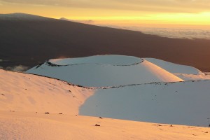 天候は良好、冠雪したマウナケア・マウナロアを望みながら広大なパーカー牧場を通り、サドル・ロードで高度を上げる。オニズカ・ビジターセンター(2900m)で高所順応の為1時間ほど休憩。付近では銀色の穂が生る珍しいシルバー・スォードという植物が見られる。日本食の弁当に味噌汁も配られサービスが良い。日没に合わせて山頂へ、高所に鳴らすため溶岩跡など見ながらゆっくりと上がっていく。高所に来てあの息苦しくだるい感覚を久々に味わう。時々大量の雪を荷台に積んでいる車を見かける。自宅の前に雪だるまを飾るためなんだそうだ。