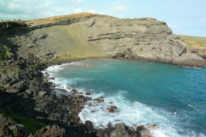 ガイドを良く見ると、陸地側の道を車でもう少し入ったところの駐車場から歩くのが正解で、サウス・ポイントからはかなり余分に歩く必要があって失敗だった。またガイドの記載と違い4WD車が結構入ってくるので歩くのはあまり快適ではなかった。小さな丘を越えるたびにこの先に見えるかと思うと期待を裏切られる。やっとグリーンサンド・ビーチを目にすることができた。周囲を絶壁で囲まれた小さめの入り江で、海と砂浜の色合いが見たことも無いコントラストで、ここまでの苦労が報われたと思う。砂浜への降り口が垂直な岩場になっているが、高度差はわずかでスタンスも十分あり問題ない。4WDで乗り入れて水着姿で泳いでいる人も多かった。帰りのことを考えると長居はできないので早々に引き返す。