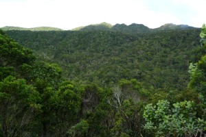 往路を忠実に戻る。進むにつれ、霧が晴れて時折ピヘア展望台付近にごつごつした小ピークが連なっているのが見える。十字路までの間に、結構多くのハイカーとすれ違った。彼らはそんなに泥まみれになってなかった。おそらく十字路から下の方に行くと林道があって4WD車が乗り入れできるのだろう。十字路から登りかえして木道が切れると再び泥と格闘になる。ピヘア展望台までは、他に数パーティが同様に泥まみれで登っていた。駐車場が近づくと人が増えるが、観光客はこの状態のためすぐに引きかえしている。若者のグループには、私を指差して笑いながら "It's a Mudder" と言われる。裸尾根の原因は島の周回道路計画で、かつて途中まで道路工事が行われた為で、結局この地形への道路建設は断念されたのだ。