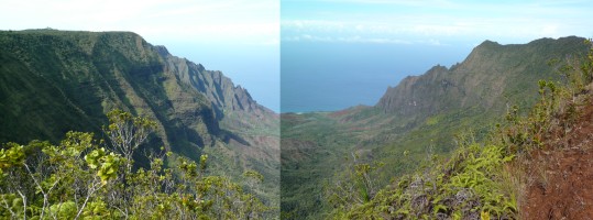 翌朝は早出ちしてコケエ・ロードを登っていき、太平洋のグランドキャニオンといわれる一帯の山岳公園で1日トレール巡りを楽しむ。多雨地帯のカウアイにしては、幸い青空も見られ天候もまずまずだ。途中景色の良い場所がいくつかあるが、まずは終点のプウオキラ展望台(1250m)から最奥のトレールとなるアラカイ湿原を目指す。朝早い時間はまだ人の訪れも無い。展望台から、眼下の海岸まで1000m以上の崖となって落ち込むカララウ渓谷の景観は圧倒。ところが一歩トレールに踏み入れると、赤土の裸尾根でつるつる、昔のバカ尾根を最悪にした状態。こけながら歩くのですぐに泥だらけになる。部分的な急斜面は通過困難状態であったが、段差をとらえて木にしがみついたりして突破。分岐から左へ滑る急斜面を注意してピヘア展望台のピーク(1285m)へ、雲がでてきてしまい展望はいまいち。