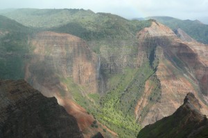 途中のコケエ・ロッジのキャンプサイトで泥おとしをして少し落ち着いてから、次はワイポオ滝トレールに向かう。日曜日ということもありたくさんの車が上がってくるが、トレール入口には駐車スペースを見つけることができた。最初は4WD車のみ乗入れ可能な林道を下り気味に進む。山道になってすぐの分岐を右に入るとクリフ展望台があり、グランドキャニオンさながらの絶景が堪能できる。ワイアレアレに雨を降らせた風が超えてきて、こちら側は比較的晴れ間が多くなるようだ。トレールの道の状態もまずまず良好。ワイポオ滝の手前にも開けた好展望地があり、沢に向けて下ると滝の落口になる。足場が悪く滝の全景も見えないのであまりパットしない所であった。ここまでは多くのハイカーで賑わっていたが、この先のトレールは荒れていて一般向きではない模様。