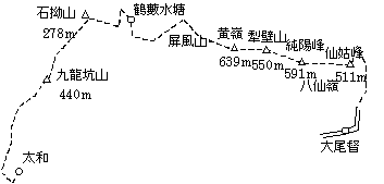 仙姑峰から大尾督(Tai Mei Tuk)に直接下る道は通行止め。直下に96年に山火事遭難事故という悲劇があった岩場があり、特に下るのは危険のようだ。一旦反対方向に下って山腹を巻くTrailに入る。所々でHiking Festivalの横断幕を見る。明日はもっと多くの人で賑わいそうだ。ダム近くの公園はバーベキューを楽しむ家族連れで賑わっていた。縦走した山々が屏風のように聳えていた。