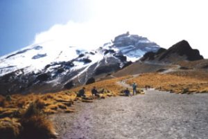 火口壁からの下降点に着くと、残った2人は既に下山を開始していた。我々は疲れたのと天候も持ちそうなので、しばし大休止してから下降開始。雪が柔らかくアイゼンのダンゴに注意して下る。下降にも特に不安は無かった。下部では慣れてくると尻セードの遊びも交えたりする。だらだらと遊歩道を下り、先に下山した2人が待つトラマカスへ。もうこの高度には慣れたかと思いきや、登頂の疲れもあり頭痛もあいかわらず続き、夜もいまひとつ熟睡できない。