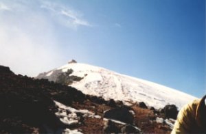 斜面を登りきると、目の前に風化した岩と雪で囲まれた噴火口が現れる。硫黄の臭いが鼻を突く。しばし大休止の後、あと頂上まで標高差200m頑張ろうとするが、N,Mさんはこれ以上登れないというので、待っていてもらって、私とメキシコのガイド2人とドイツ人で頂上へ向かった。雪が消えて土が露出した所もある外輪山をたどる。タイムリミットは12時ということになり、これまでのゆっくりペースから一転してかなり早いペース。この高度で苦しさもひとしおだが、頂上も目の前であり、全力をぶんばって登る。