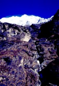 ヤンサツェンジ(6575m)、2つの山の間からキムシュン氷河が一気に落ちてきている。右側には